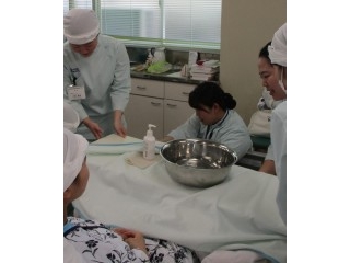 身体の清潔援助技術に4年生が参加しました。4年間の中で身についた技術を4年生から1年生に伝え、 1年生は先輩のアドバイスに耳を傾けながら真剣な表情で技術を行っていました。