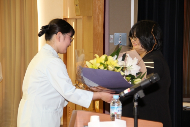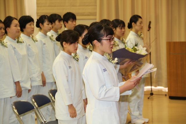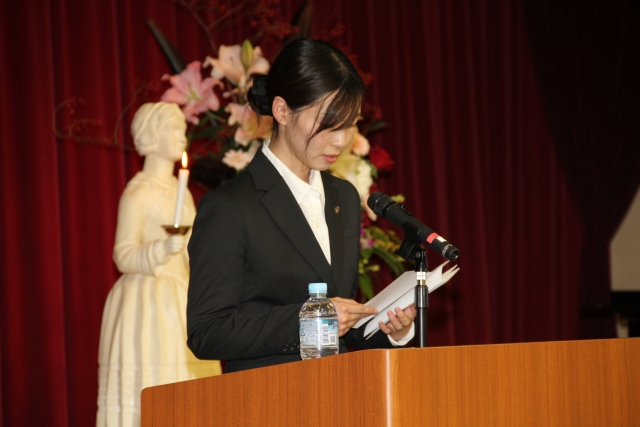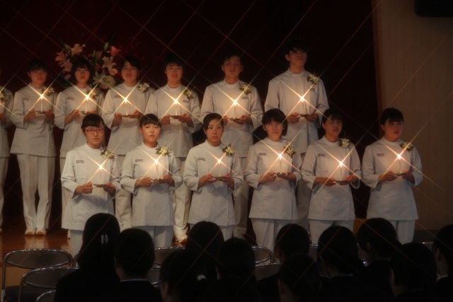 11月8日(木)13時より42期生35名の宣誓式が執り行われました。実行委員を中心に自分たちの手で式を作り上げていきました。当日はナイチンゲール誓詞を唱え、さらに自分たちの言葉でも宣誓を述べ、最後は歌で、自分たちの気持ちを表現しました。とても厳粛な中、ピアノ伴奏と共にナイチンゲールから看護の灯を受け継ぎました。学校長や同窓会長、在校生からお祝いの言葉をいただき、式終了後は、卒業生である上川亜矢様(社会医療法人里仁会 興生総合病院 緩和ケア認定看護師)より~緩和ケアを通して学んだ看護の力~ー患者・家族に寄り添うとはーと題して、貴重なお話を聞かせていただきました。看護の力の偉大さを改めて実感し、看護について考える機会を持ちました。皆様に感謝するとともに、患者様に安全で安楽なケアが実践できるように、努力をしていきます。