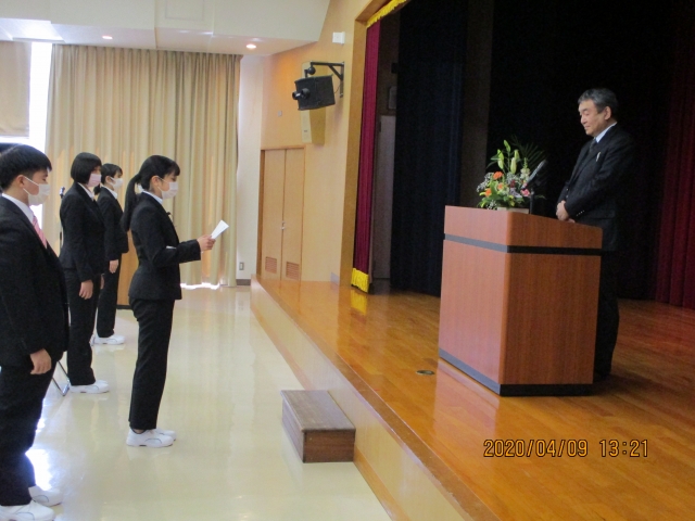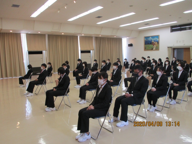 4月9日(木)新型コロナウィルス感染拡大予防のため入学式を縮小し、新入生と教職員のみで入学式を行いました。来賓の方々や保護者の方々と入学式を迎えたかったのですが、参加予定の方々の健康と安全、感染拡大防止を考えこのような判断をいたしました。新型コロナウィルスの関係で入学式をを迎えることができるか不安でしたが、無事43名新入生を迎えることができ大変うれしく思います。体調管理、全員マスク着用、手指消毒、換気など感染予防を徹底しながら安全に学習できる環境を整えていきたいと思います。