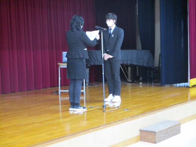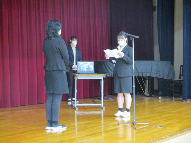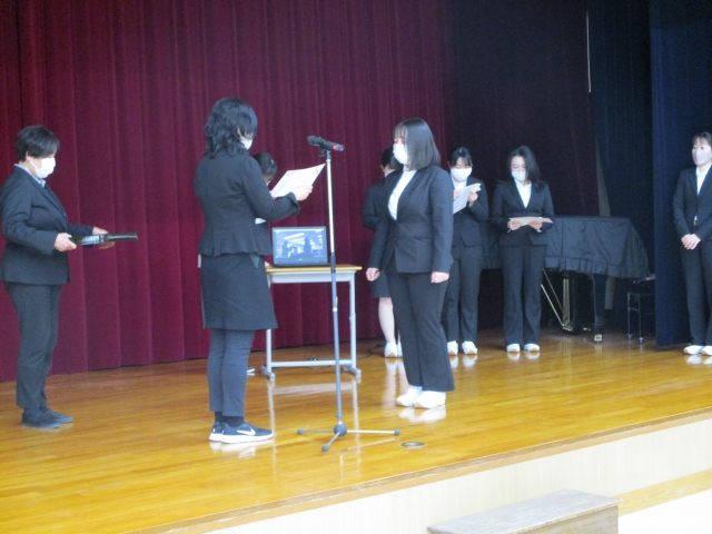 その後、学校・同窓会・自治会より卒業生へ記念品贈呈式を行いました。卒業生からはパルスオキシメーターを寄贈してもらいました。8か月間の実習で1日も休むことなく皆勤賞で頑張った6名の学生に記念品と温かい拍手を送りました。また、あと少しで学生生活も終わりです。元気で頑張ってほしいと願っています。