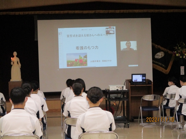 式終了後は卒業生の講演を行いました。現場で頑張っている様子・応援メッセージを聞き、学生は「自分もどのような看護師になりたいかを明確にし頑張りたい」「先輩のように、人と人とのつながりを大切にできる看護師を目指したい」とこれからの決意を新たにしていました。今日の気持ちを忘れず目標に向かって、今ここから前進していきたいと思います。