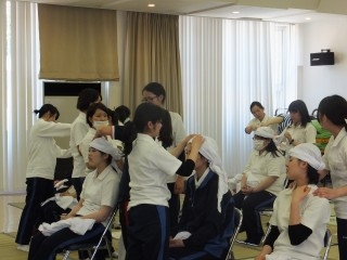 包帯法など実習を行いました。筆記・実技試験を行い、「救急法救急員」の認定を受けることができました。 -